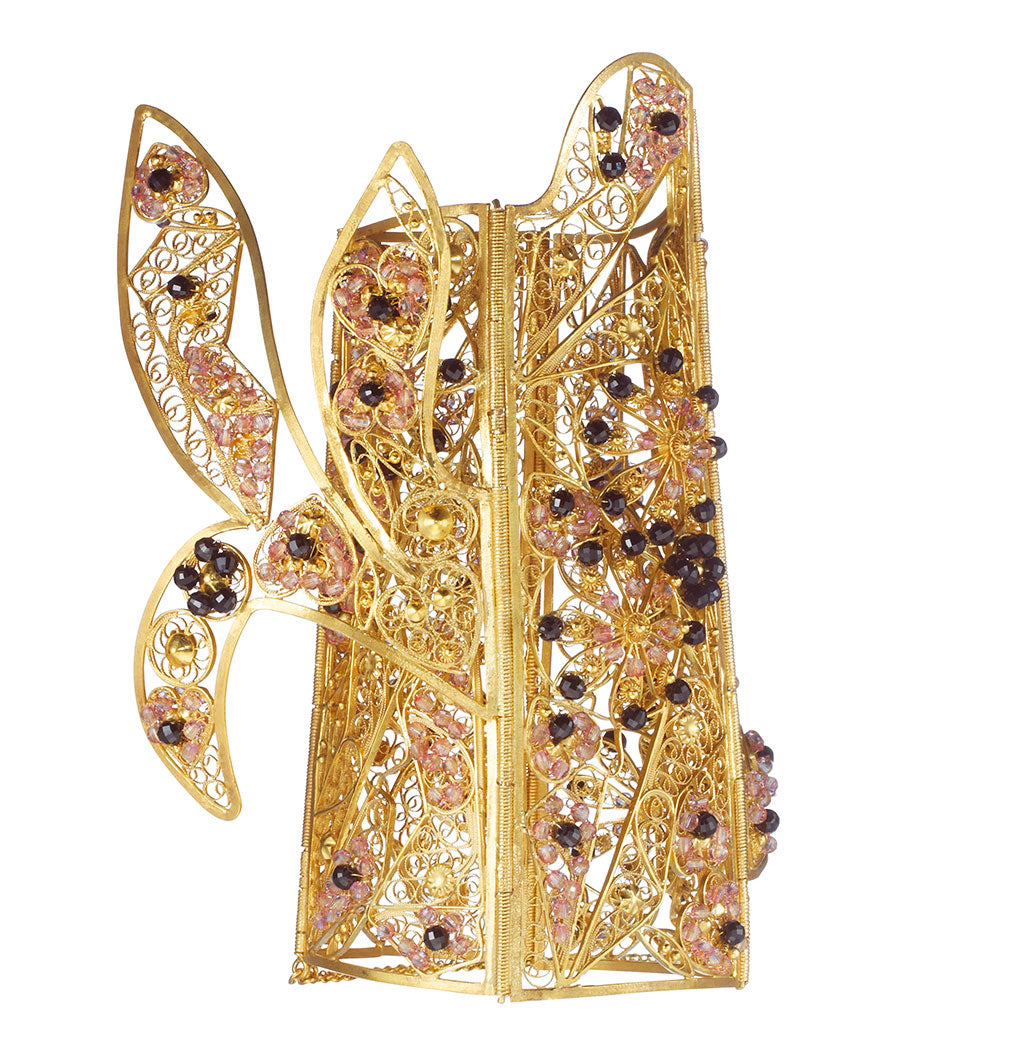 Filigree has been part of Lebrusan Studio’s design language from the very beginning, rooted in Arabel Lebrusan’s Spanish heritage and inspired by traditional adornment such as the traje de fallera and charro buttons. The studio is drawn to its fine, intricate threads of gold and silver, which allow metal to be drawn almost like a line. For Lebrusan Studio, filigree is a way of creating bold, statement pieces that remain light in weight but strong in identity, a classic tradition, continually reinvented.