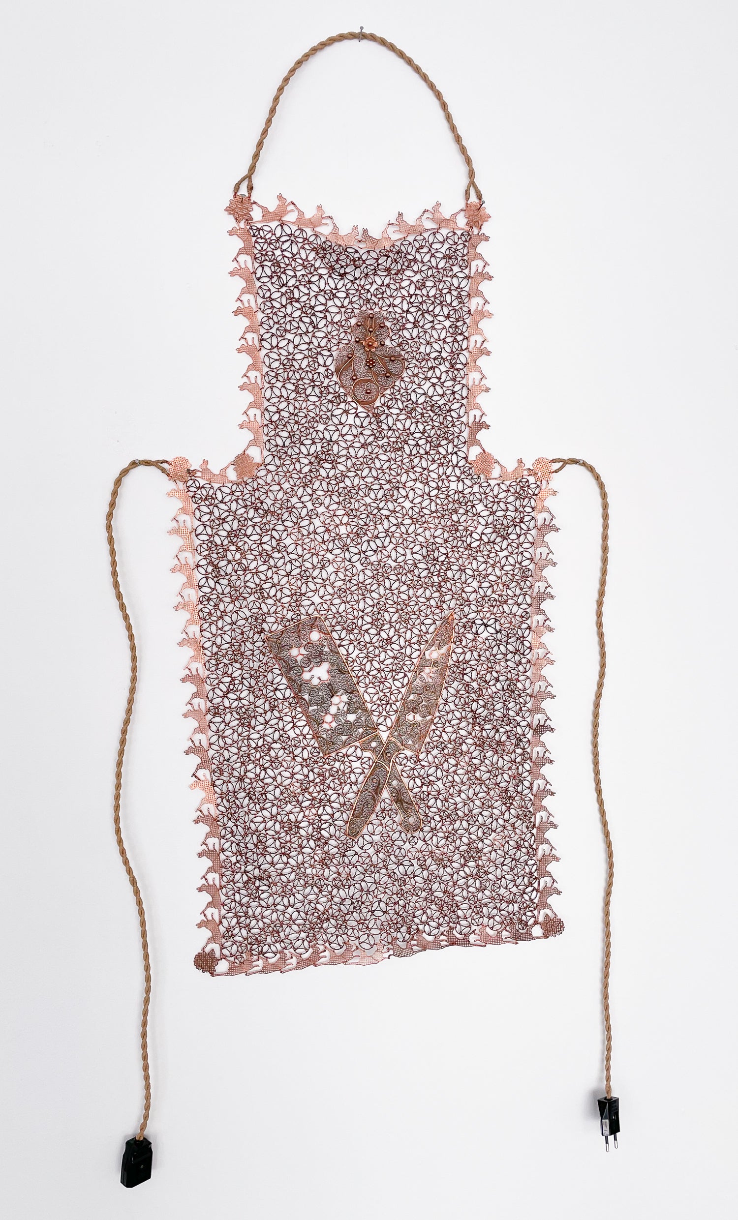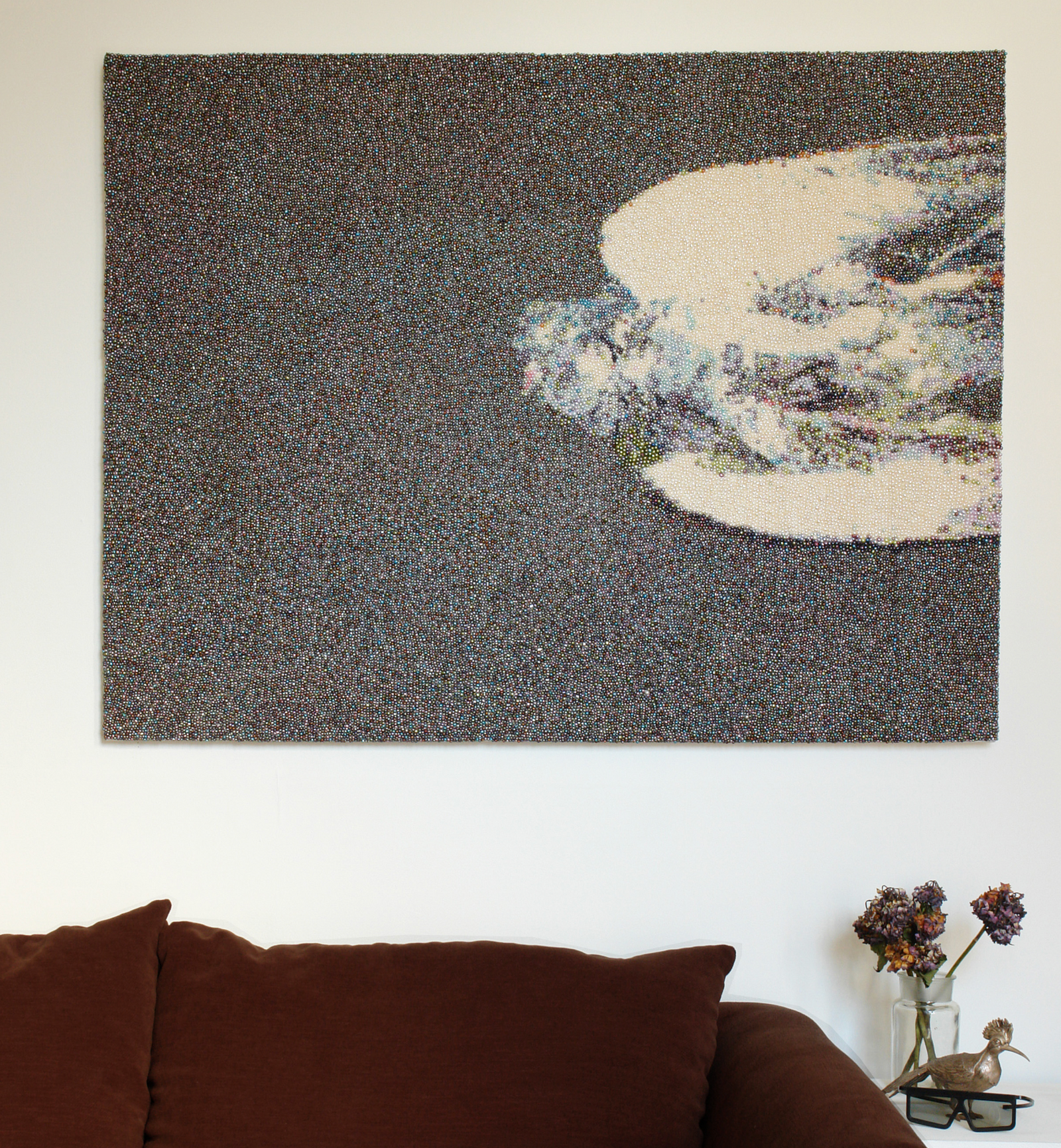 When death becomes beauty (2008) is a necklace and tapestry made of natural freshwater pearls. The title, which suggests the conflict between aesthetics and ethics, is echoed in the luster of countless pearls that are carefully strung together to depict a dead pigeon floating on water.