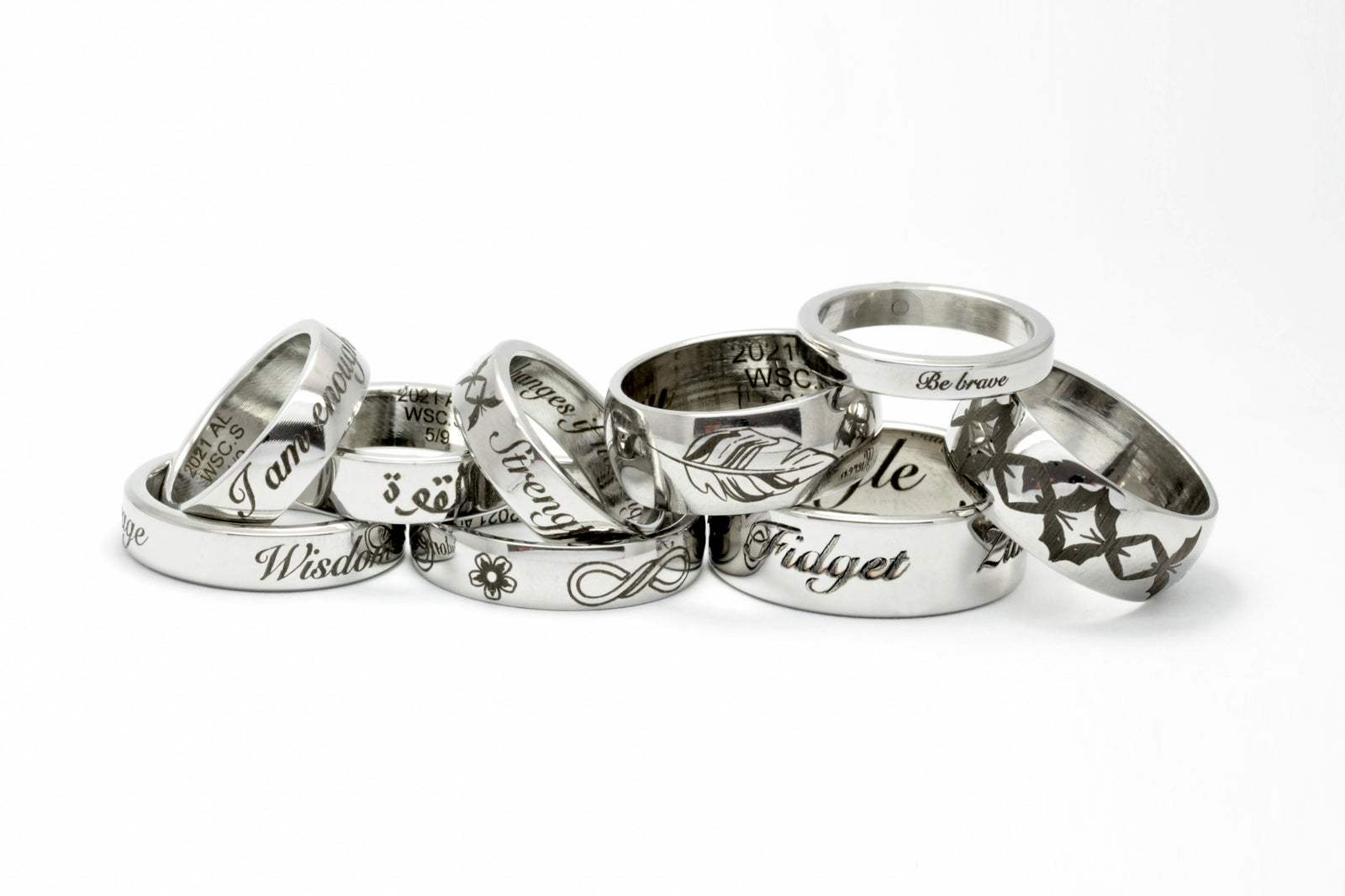 Knife Murders 275/275 England and Wales is a set of 275 rings made using the metal from police confiscated knives and other artefacts. The rings represent homicides in England and Wales from April 2019 until March 2020. There are 10 small-sized rings to represent under children homicides (those aged under 16 years), 50 medium-sized thin rings to represent women homicides and 215 wide and large-sized rings to represent men homicides. Each ring is laser inscribed with the edition number AL KM20 1/275, AL KM 20 2/275, etc.