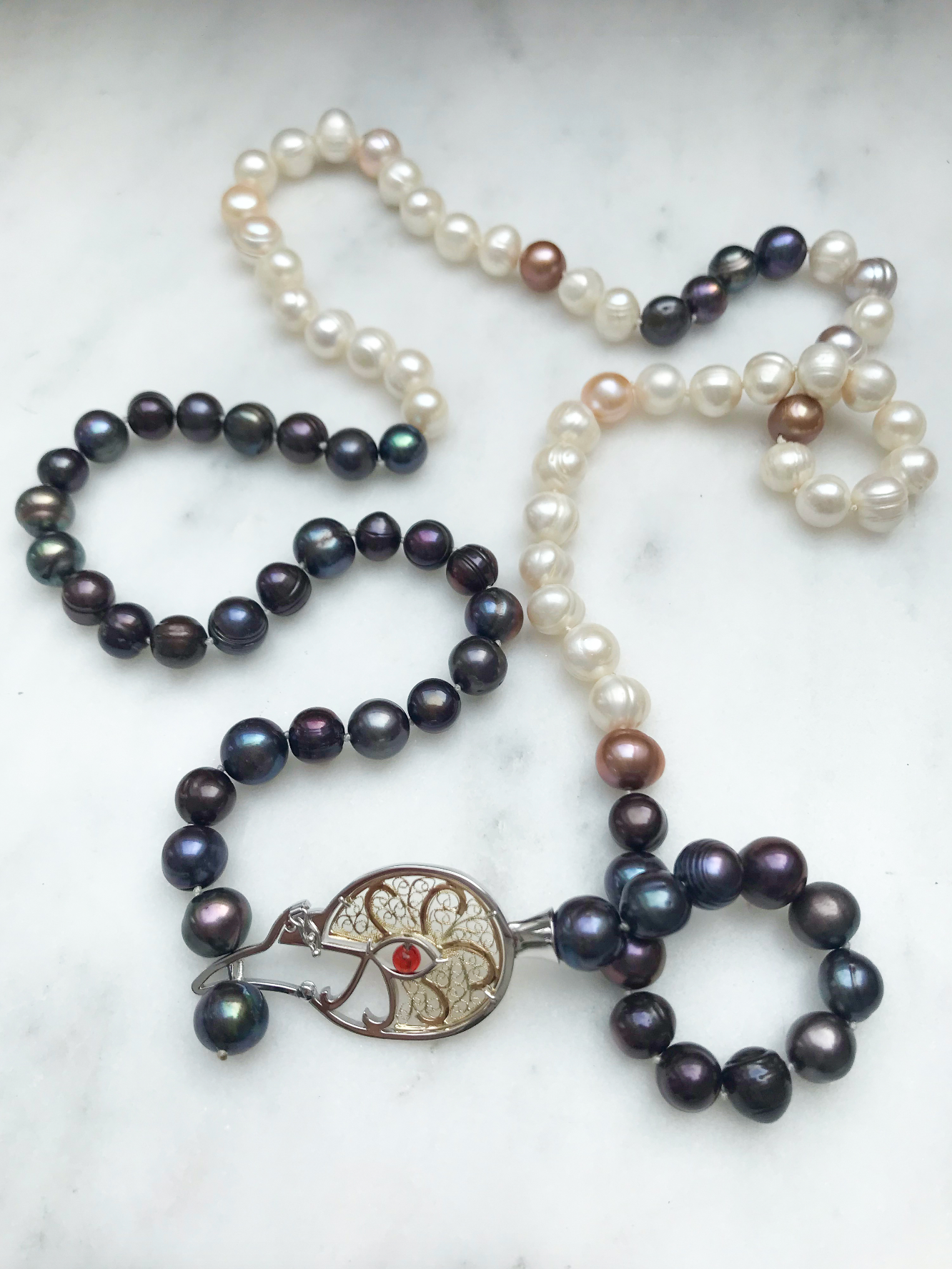 Medium: Pearl Tapestry & Pearl Neckline. Tapestry. Natural fresh water pearls. Dye. Thread. Neckline. Natural fresh water pearls. Dye. 18ct ethical gold, sterling silver, Australian fire opal. Unique, in private collection.