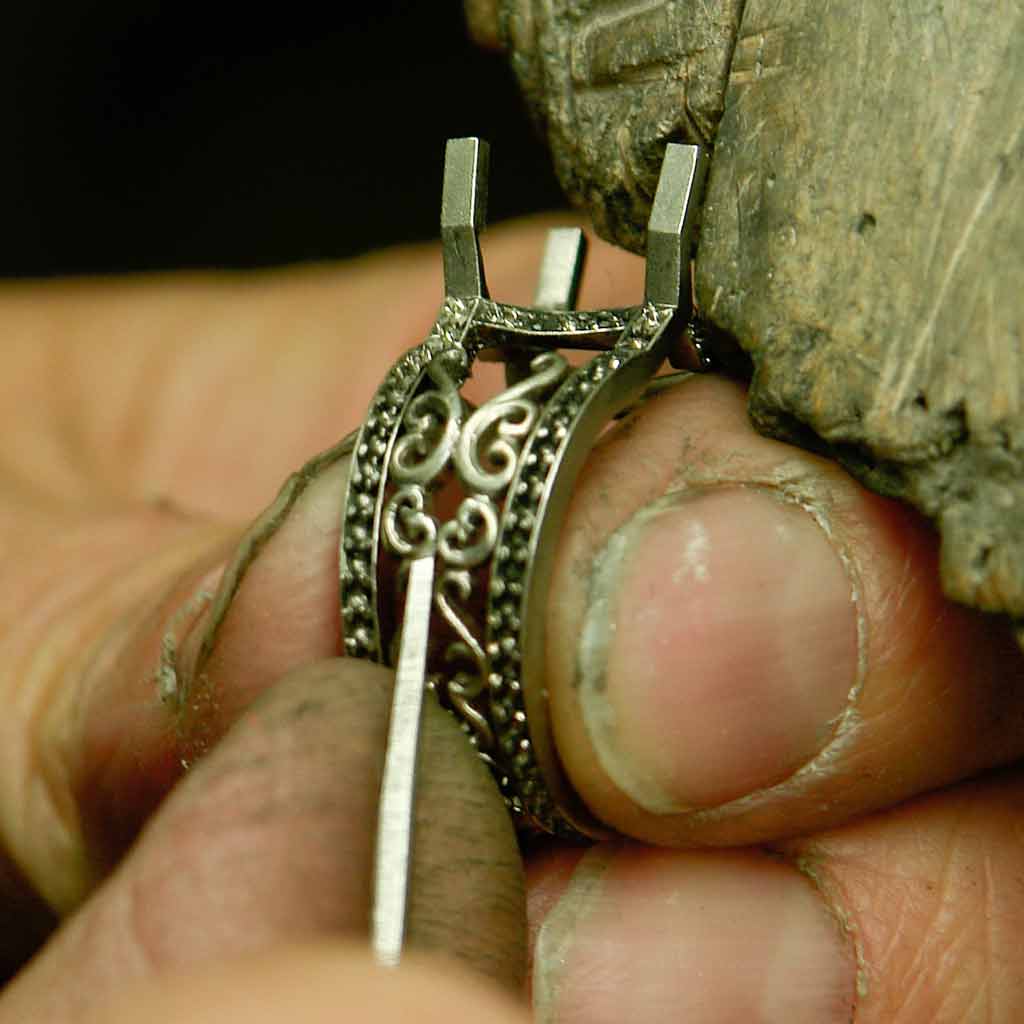 Officially the world's most reflective metal, silver was the first metal ever to be used as currency. Though once valued higher than gold by the Ancient Egyptians, silver scores much lower than gold and platinum on the Mohs Scale of Hardness, which is why we don't use it to create our custom-made jewellery. Recycled sterling silver is, however, the basis of our archived filigree collections.