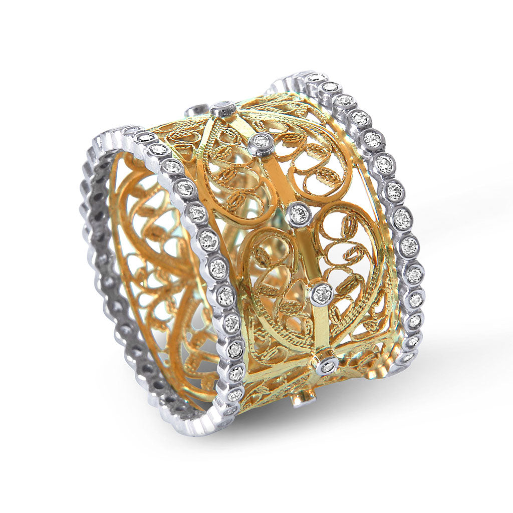 The most exciting jewellery is that which rethinks the margins. This chunky band is an engagement ring and wedding ring combined, enabling Amy to say all she needs to say via the medium of one striking jewel. Merging recycled white and yellow gold, a plethora of small conflict-free diamonds and Lorenzo's signature filigree lacework, this ornate creation is just as much a visual spectacle as an intimate symbol of lifelong commitment.