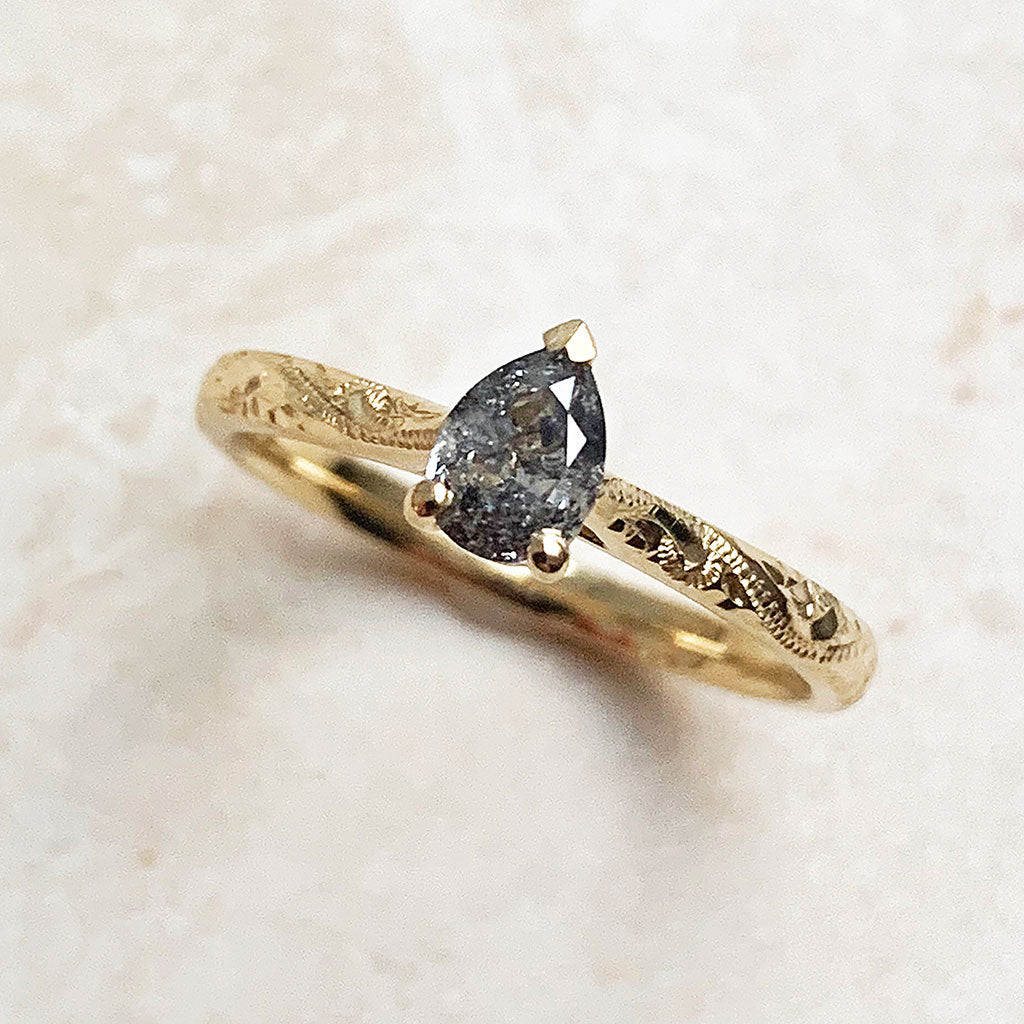 When compared to the rarity of colourless stones, the commercial abundance of salt and pepper diamonds goes hand in hand with their high volume of inclusions to make them a much cheaper option. This affordability kicks open the doors of possibility when it comes to stone size and cut, making a salt and pepper diamond fun for the cost-conscious couple to work with – without sacrificing the diamond guarantee of durability.