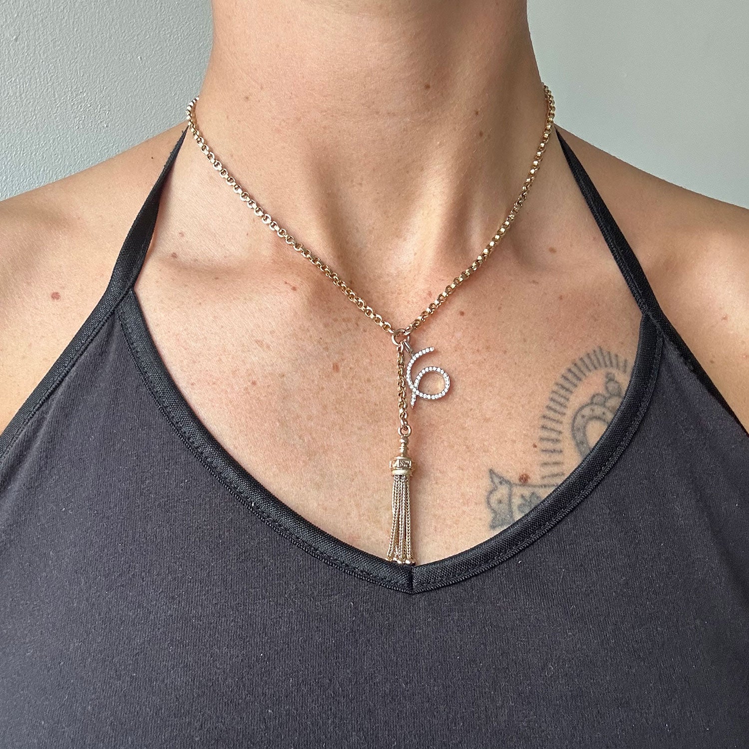 * Newly-designed figure-of-six charm crafted in 18ct recycled white gold and set with conflict-free diamonds, reclaimed antique tassel pendant and reclaimed antique 9ct gold Victorian chain